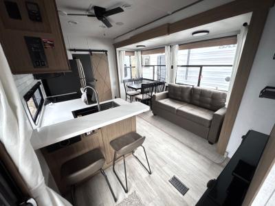 The Forest River Salem Villa Series destination trailer offers you an excellent space to relax in and rejuvenate your adventurous spirit! The 7' slide-out height is going to provide you with an open and spacious living area, and the heated and enclosed accessi-belly will protect your trailer from the elements. The Salem Villa Series comes loaded with upgraded designer furniture, a modern headboard redesign, stainless steel kitchen appliances, adjustable texture roller shades and enhanced floating shelves. There is also a few new features, including JBL speakers in the interior/exterior, a 4K blade lighting, a 60K tankless water heater, and more comforts!