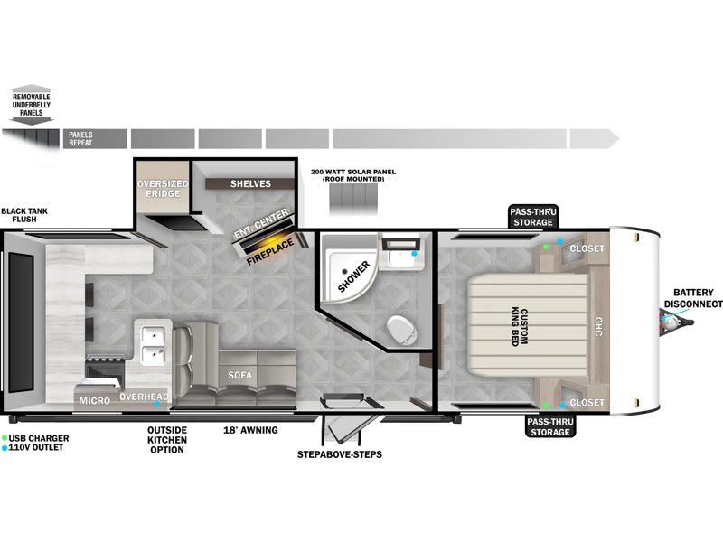 - Extended Power Package: Roof Mounted 200W Solar Panel, and 30 Amp Controller