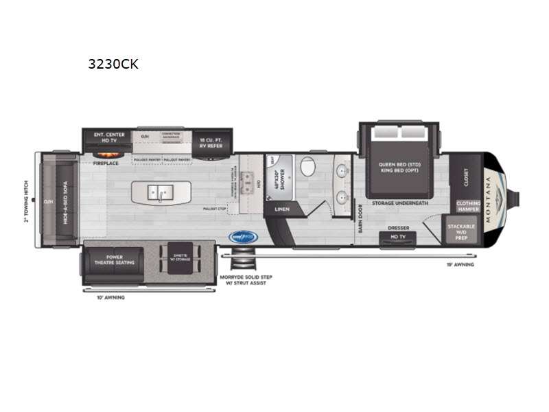 If you are an experienced RVer who is ready to gain more freedom on the road, then you need to check out the Keystone Montana fifth wheel! With exceptional craftsmanship, durable construction, dependable luxury, and cutting-edge technology, the Montana is truly a dream. The Montana has some easy set-up features, like an electric patio awning with LED lights, Hitch Vision with LED lighting, and MORryde Step Above entry steps with strut assist for an easy entrance. The Four Seasons Living Package allows you to camp year around with features such as, a heated and enclosed underbelly, a reflective foil insulated front cap, dual attic vents, and more! The Montana has you covered with convenient camping features, like the central vacuum, the stackable washer and dryer prep, and the Whisper Quiet Cool A/C's for an evenly and quietly cooled RV. Each model includes solid hardwood cabinet stiles, a 5K BTU decorative fireplace heater, a high-rise pull down faucet in the kitchen, plus many more interior comforts to make you feel right at home.